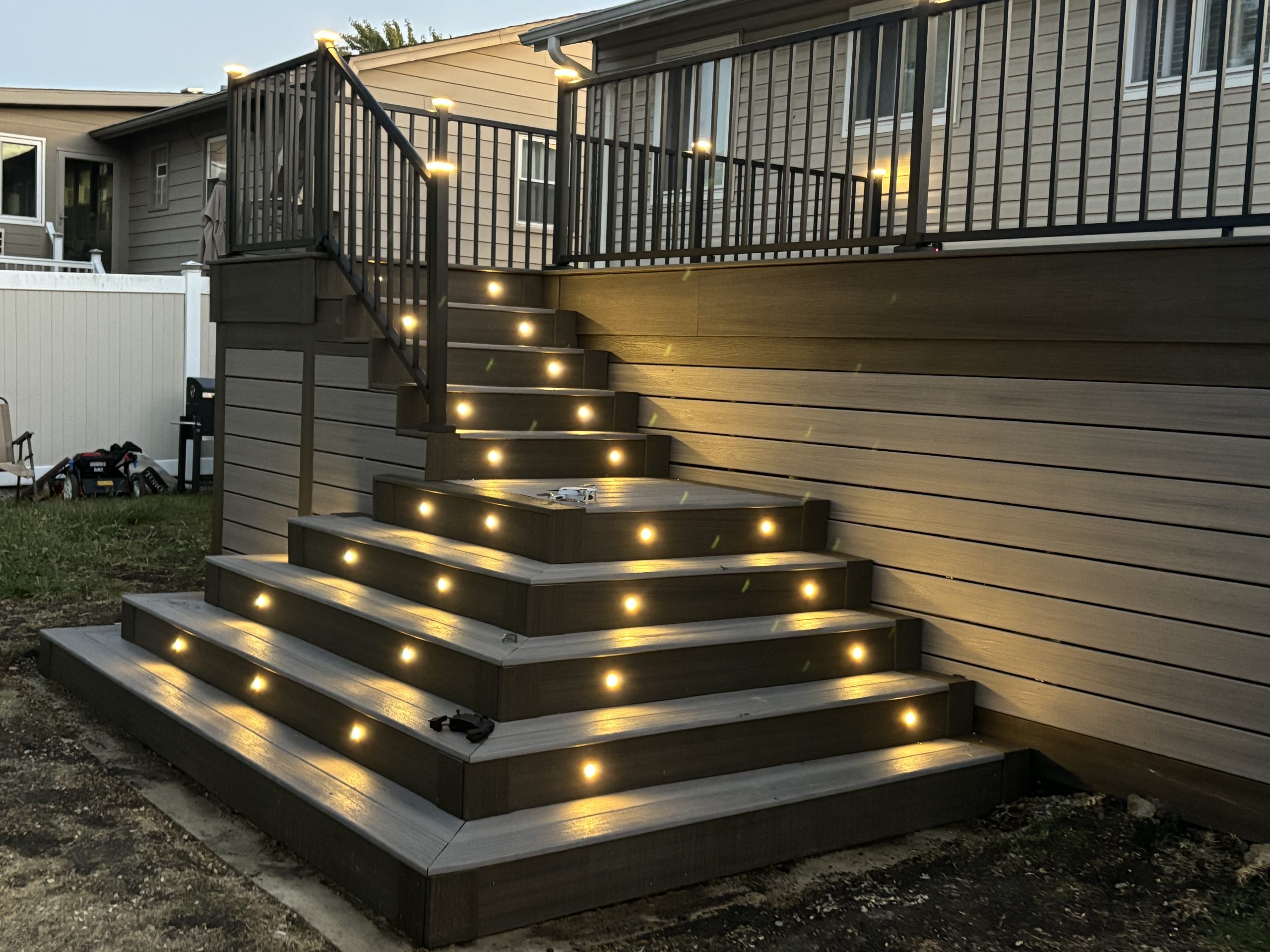 We recently completed a beautiful 12×20 ft deck in Country Club Hills, Illinois, featuring durable Trex composite decking and stunning custom cascading stairs that add both function and visual appeal.